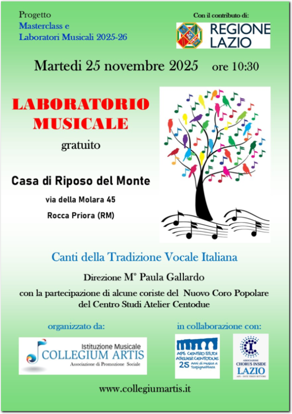 In collaborazione con Collegium Artis e con la Regione Lazio, la M° Paula Gallardo guiderà un laboratorio musicale nella Casa di Riposo "Del Monte" a Rocca Priora. Il Nuovo Coro Popolare parteciperà per il supporto vocale.