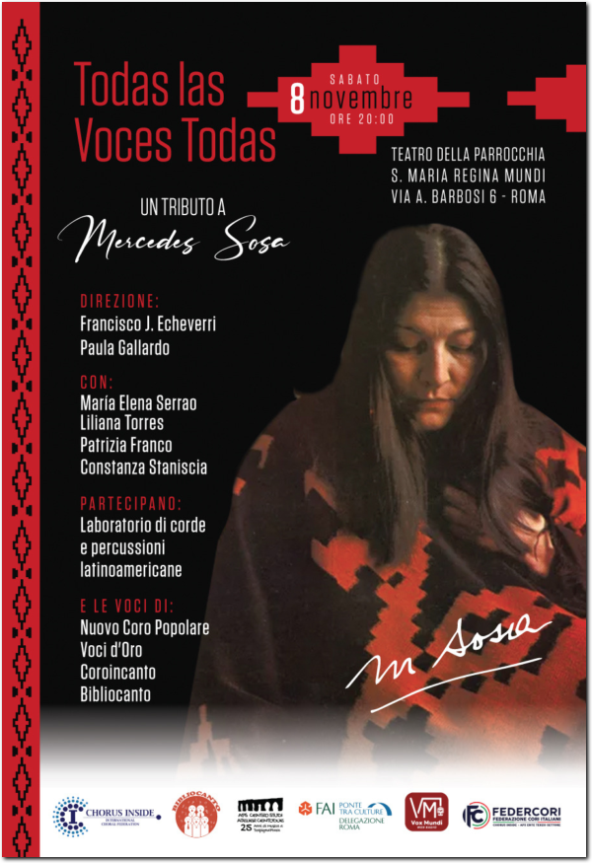 Presso il Teatro della Parrocchia Santa Maria Regina Mundi in via Barbosi 6 a Roma, sabato 23 novembre alle ore 18:00: Todas las voces todas, Tributo a Mercedes Sosa, ideato da Francisco J. Echeverri, direzione musicale di Francisco J. Echeverri e Paula Gallardo, Maria Elena Serrao, e le voci di: Voci d’Oro, Nuovo Coro Popolare, Coroincanto, Bibliocanto.