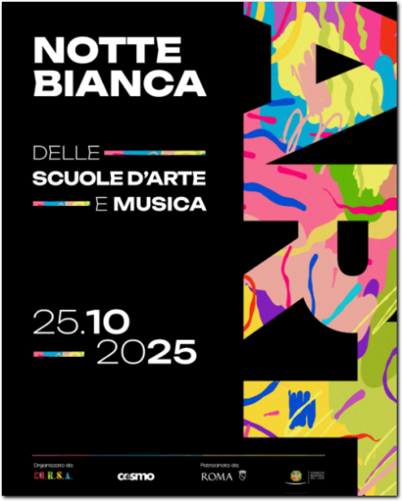 Il 25 ottobre 2025 le Scuole d'Arte del Lazio accendono la città con un evento unico: la Notte Bianca delle Scuole d'Arte. Un'occasione straordinaria per mostrare alle istituzioni, al pubblico e alla comunità quanto la creatività sia necessaria, viva e trasformativa.