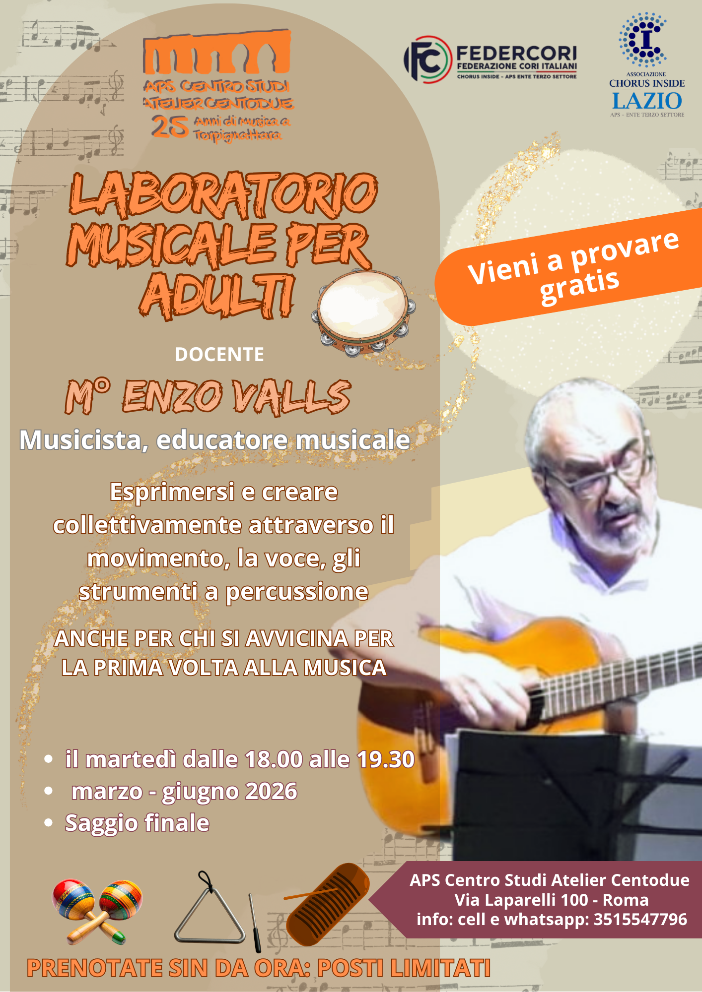 Un laboratorio per tutti, anche chi si avvicina alla musica per la prima volta. Divertirsi imparando è il motto di Enzo Valls che vive in Italia da oltre trenta anni.