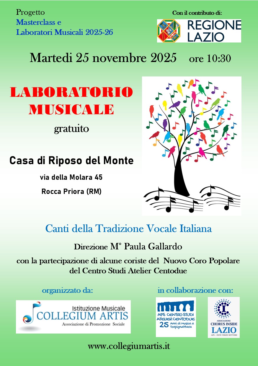 In collaborazione con Collegium Artis e con la Regione Lazio, la M° Paula Gallardo guiderà un laboratorio musicale nella Casa di Riposo "Del Monte" a Rocca Priora. Il Nuovo Coro Popolare parteciperà per il supporto vocale.